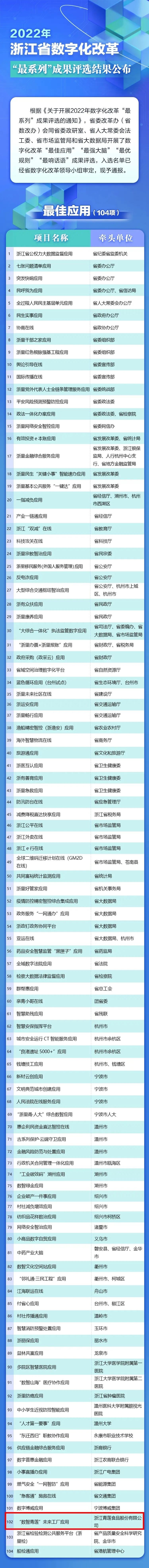 10月29日,省委改革辦(省數(shù)改辦)公布2022年數(shù)字化改革“最系列”成果。其中,浙江青蓮食品股份有限公司“數(shù)智青蓮”未來(lái)工廠獲得“最佳應(yīng)用”殊榮,也是全省入選者中唯一一家未來(lái)工廠!