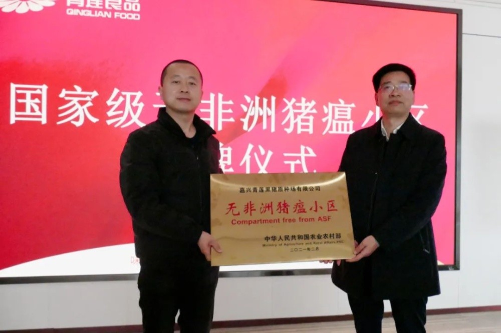 2022年1月25日,青蓮旗下嘉興青蓮黑豬原種場有限公司正式受牌國家級(jí)首批“無非洲豬瘟小區(qū)”榮譽(yù),浙江僅2家。